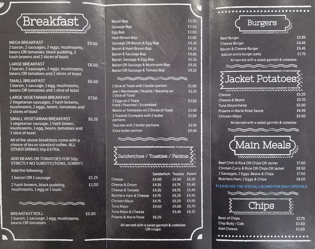 Cafe & Cream specializes in classic breakfast fare, making it a beloved spot for both locals and visitors. The menu boasts an array of options, including their renowned Mega Breakfast for £9.50, which is sure to satisfy the heartiest of appetites. This breakfast is a feast in itself, featuring perfectly cooked eggs, sizzling sausages, and crispy bacon, all served alongside a generous portion of toast. If you're after something lighter, opt for their delightful Large Vegetarian Breakfast or indulge in a Bowl Of Chips for just £3.50—a treat that pairs wonderfully with any meal.
